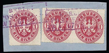 Fünf Belege mit besseren "Berlin"-Stempeln: KHBW 19b, 35a, 109 und 271a, je auf Preußen, sowie KHBW 355 nachverw. auf NDP