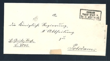"Berlin Post-Exp. 8", Ra3 vom 11.8.1862 auf Brief (kl. Tesaspur), Preußen-Stempel mit Jahreszahlen wurden erst Anfang August 1862 eingeführt, es handelt sich um einen der frühesten Belege für Stempel mit Jahreszahlen überhaupt! (Ersttag 6.8.62)