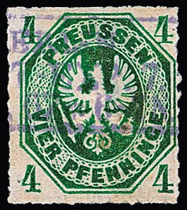 "Berlin Post-Exp. 7", Ra3 in violett klar auf 4 Pfge. grün mit fast vollem Durchstich, diese Stempelfarbe war nur neun Tage in Gebrauch, sign. Krause, Kastaun