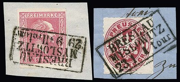 "Breslau-Myslowitz tour" bzw. "retour", Bahnpost-Ra3 auf zwei Kabinettbriefstücken 1 Sgr., sowie zusätzlich letzterer nachverw. auf Briefstück 1 Gr. NDP