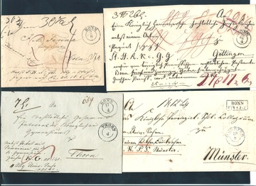 "Bonn", 1847- ca. 1860, K2 und Ra2 auf vier dekor. Paketbriefen