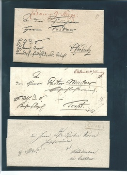 "Calau", 1817-1822, seltener Postwärter-Zacken-Ra1, sowie zweimal hs. (einmal mit L2 "Luckau"), auf drei Kabinettbriefen