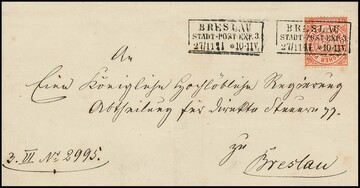 "Breslau", K2 1869, Ra3 "Breslau Stadt-Post-Exp. 3" aus Nov. 1871, auf zwei Ortsbriefen je mit Einzelfrankaturen NDP 1/2 Gr. durchstochen bzw. gezähnt (letzterer leichte Gebrauchsspuren)