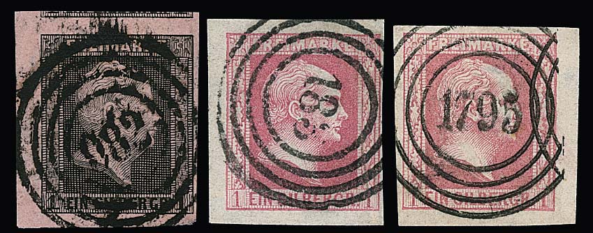 1/2 Sgr. ziegelrot bis 3 Sgr. schw./dunkelgelb, alle vier Werte einheitlich mit Federkreuz-Entwertung (Bahnpost)