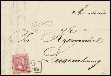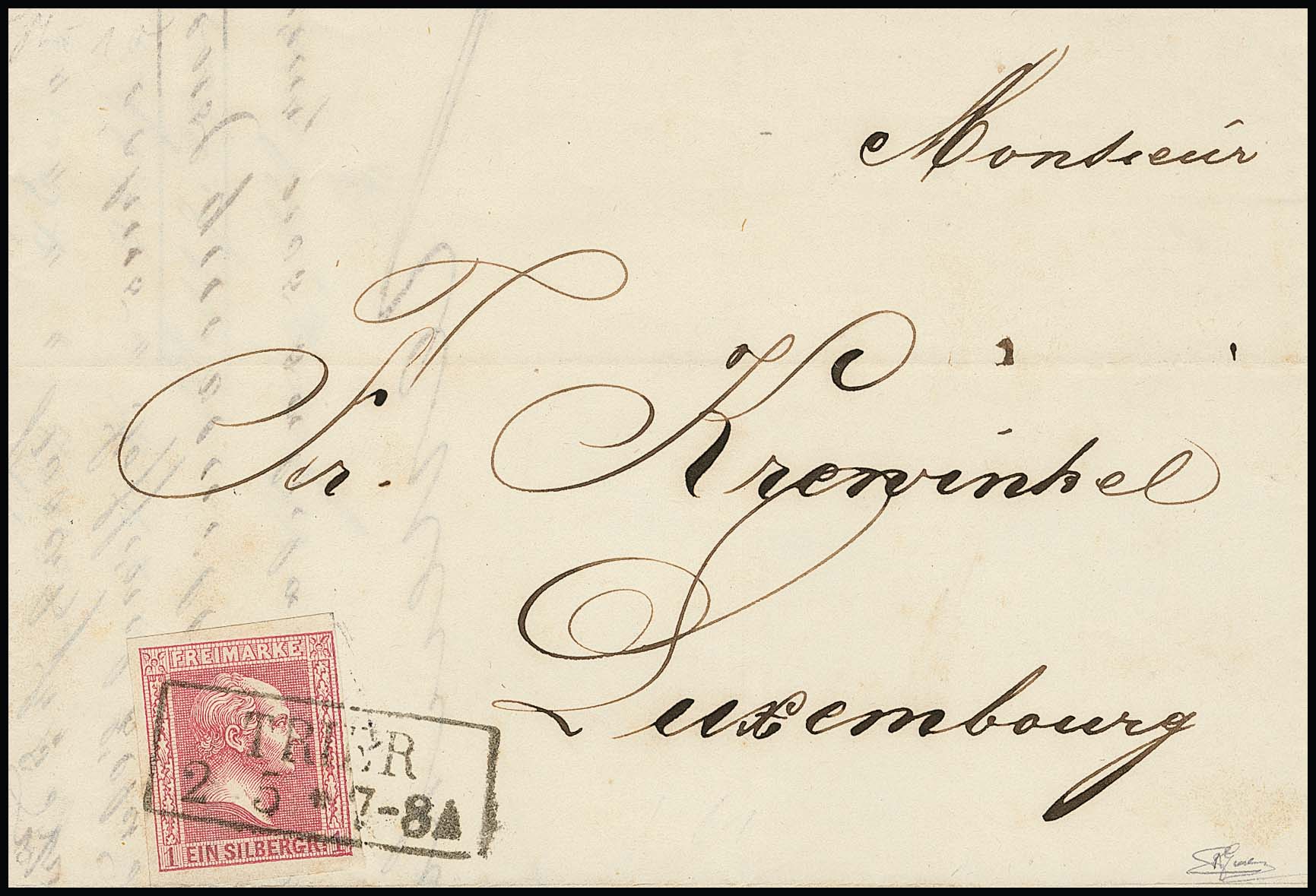 1 Sgr. schw./rosa, Prachtstück auf Brief mit NS "1520" und Ra2 "Trier" im Nahbereich nach Luxemburg, leicht wasserfleckig, sowie 1 Sgr. rosa auf Prachtbrief mit Ra2 "Trier" nach Luxemburg, sign. Goebel