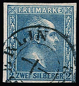 2 Sgr. blau, Plattenfehler "schräges I" (Retusche) tadellos gest. Mi. 400,-
