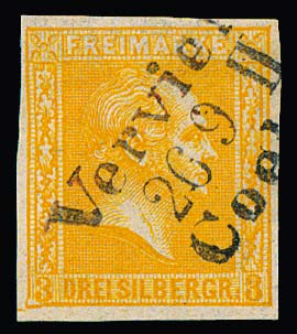 3 Sgr. gelborange, gut sichtbarer Plattenfehler "ausgebrochene linke untere Ecke", violettschwarzer Zug-L3 "Verviers-Coeln" an einigen Stellen in rot "nachgetupft"