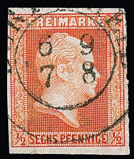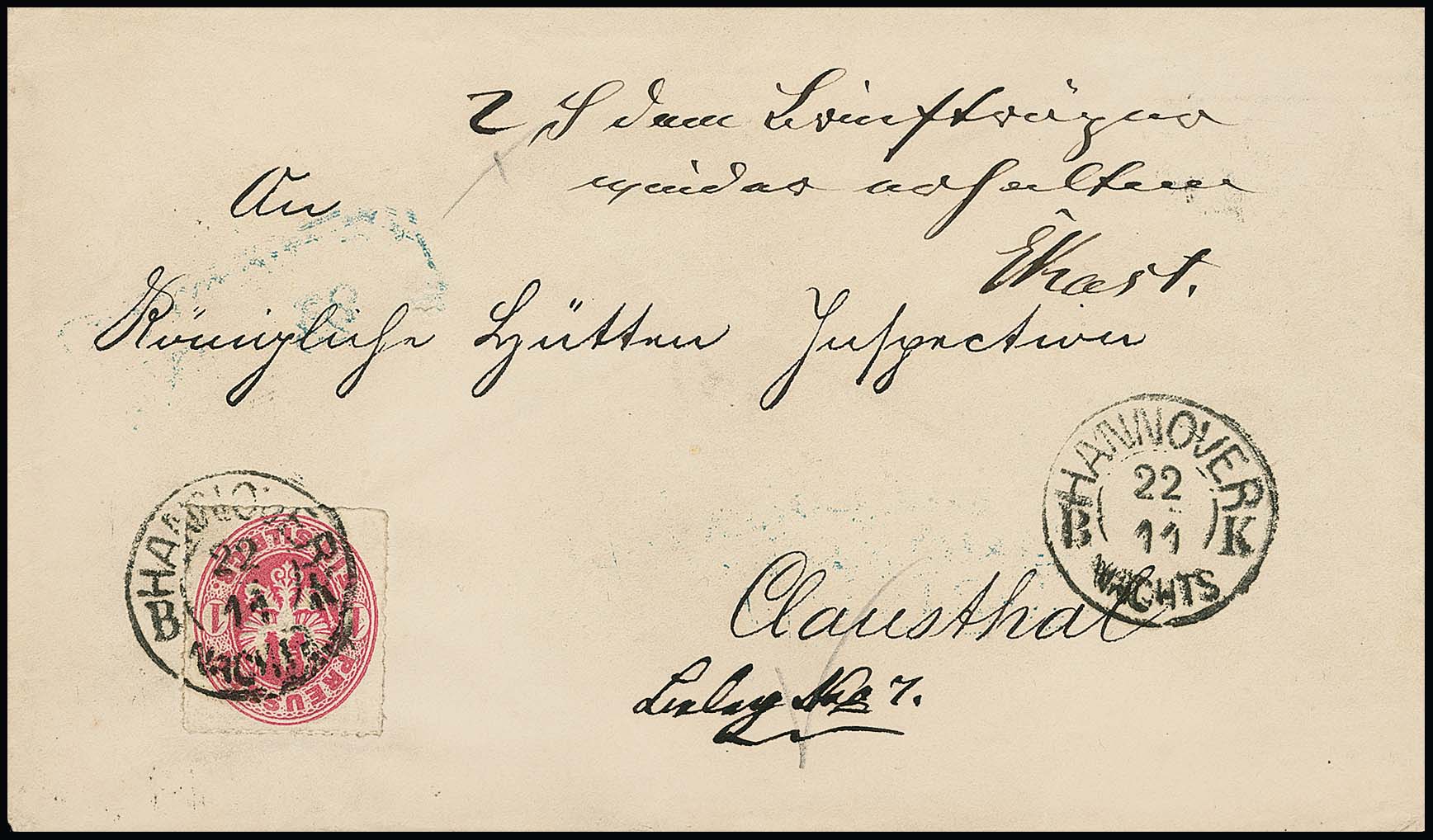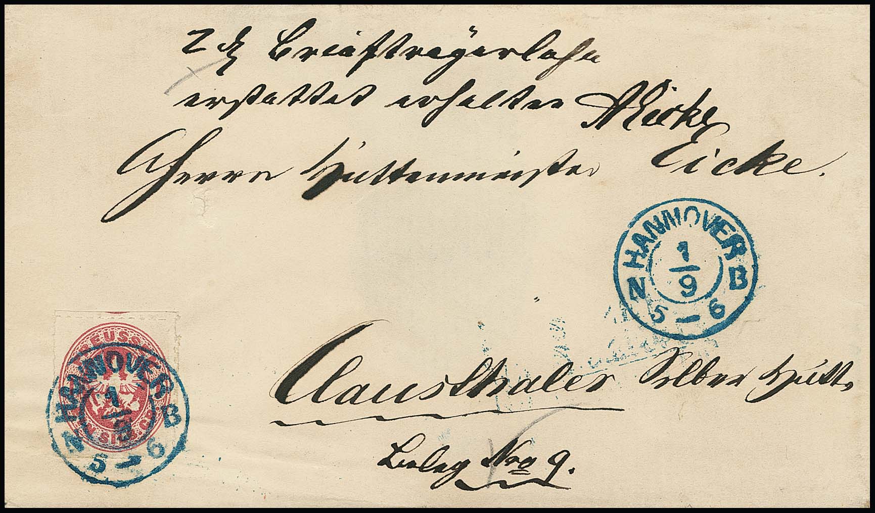 Wappen, sechs Belege, dabei Nr. 14a auf Streifband, 15a auf Ganzsache U26A (Wertbrief), zwei Briefe Nr. 16 aus gleicher Korrespondenz (blauer bzw. schwarzer K2 "Hannover" und je 2 Pfg. Botenlohn), Brief 1 und 2 Sgr., sowie Auslandsbrief mit Paar 2 Sgr. blau in die Schweiz