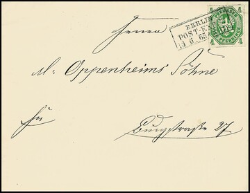 4 Pfge. dunkelgrün, tiefe, fast "b"-Farbe, perfektes Exemplar einzeln auf Ortscouvert ("schräge Ecke") mit K2 "Hannover" zum alten übernommenen Sonderporto, Attest Flemming