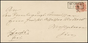 Zwei Ortsbriefe aus Münster, einmal mit Einzelfrankatur 6 Pfge. rotorange, der zweite Einzelfrankatur 1 Sgr. (kl. Eckbug, 1/2 + 1/2 Sgr. vorausfrankiertes Bestellgeld)