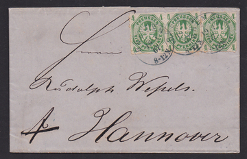 4 Pfge. bläulichgrün, Paar und Einzelstück, dieses bereits etwas fehlerhaft aufgeklebt, auf Brief mit besserem blauem K1 "Bremen" 1867 nach Hannover