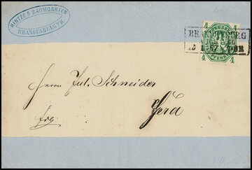 4 Pfge. dunkelgrün auf vollständiger Streifband-Drucksache (Schleife mit Inhalt) mit Ra3 von Brandenburg, sign. Brettl