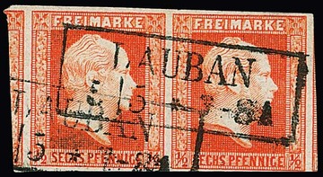 1/2 Sgr. ziegelrot, teils überrandiges Prachtpaar mit Ra2 "Lauban", links und rechts Nebenmarke, rechte Marke unten vollrandig