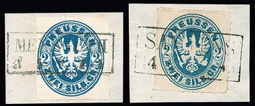 2 Sgr. preußischblau, 3 Sgr. erdbraun, gerade gestempelte Kabinettpaare, letzteres sign. Flemming. Mi. 270,-