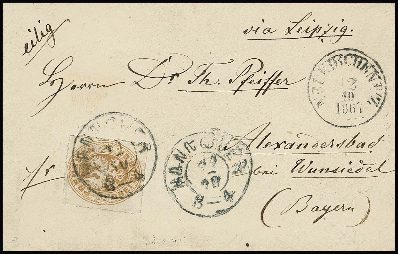 3 Sgr. braun auf kleinem Prachtcouvert mit schwarzem K2 "Hannover" nach Alexandersbad bei Wunsiedel, Taxis-K1 "Neukirchen B.Z.", 12.10.1867, sehr ungewöhnlicher Laufweg!