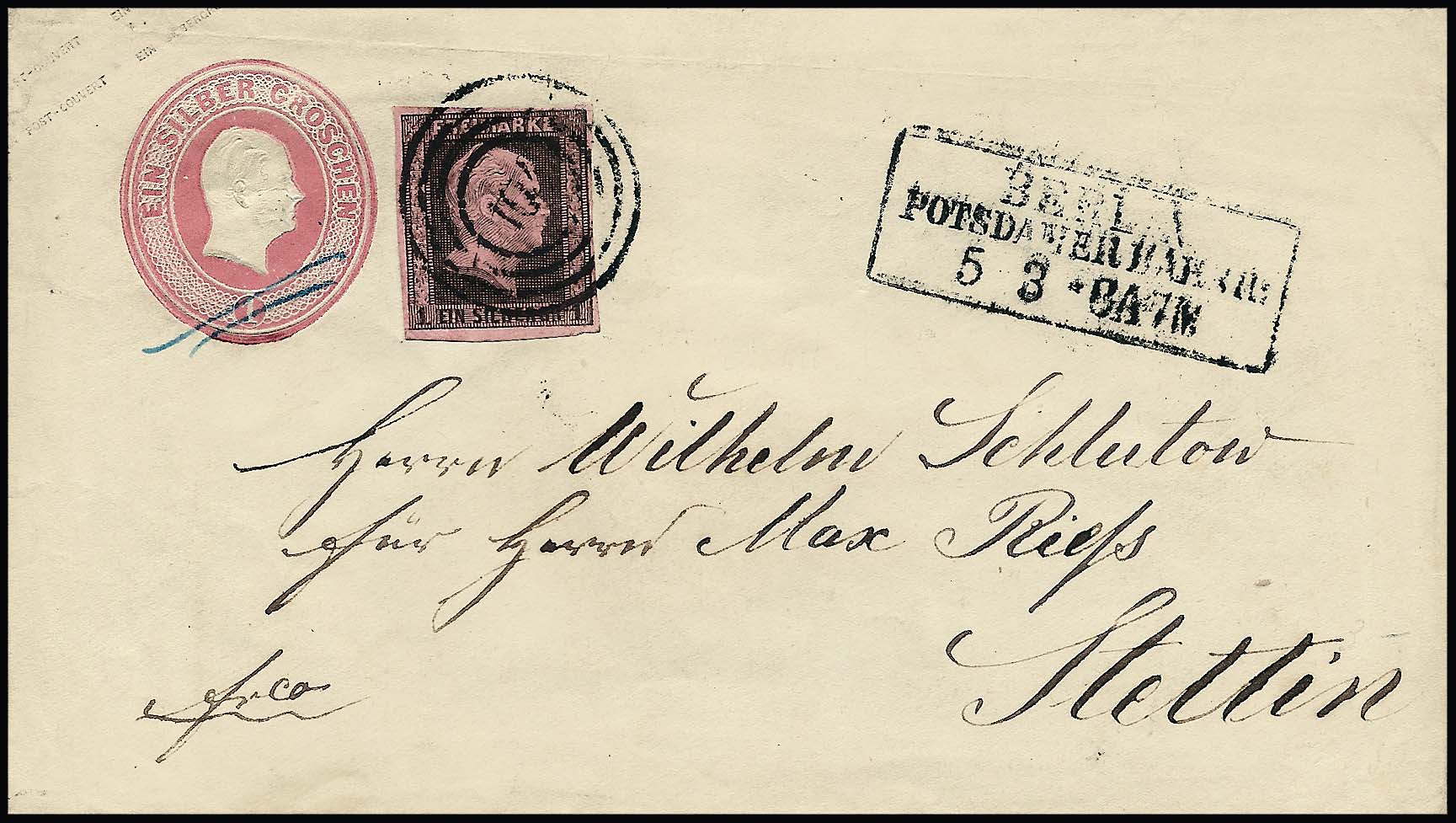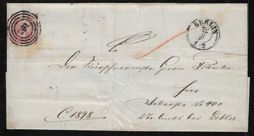 "103" nebst Ra3 "Berlin Stadtpost-Exp. XII" auf Faltbrief 1858 mit besserer Mischfrankatur 2 Sgr., 1., und 1 Sgr., 2. Ausgabe (etwas ber.)