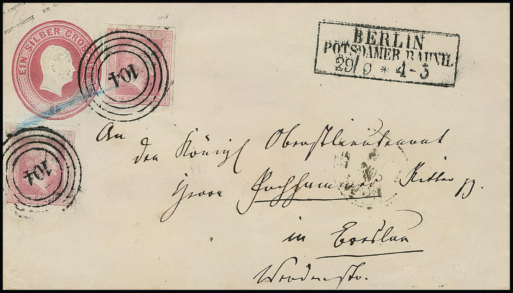 "104" nebst Ra3 "Berlin Potsdamer Bahnh." auf Ganzsache 1 Sgr. mit ZuF zweimal 1 Sgr.