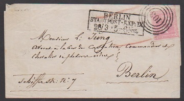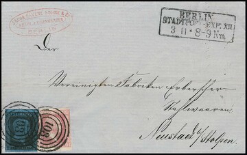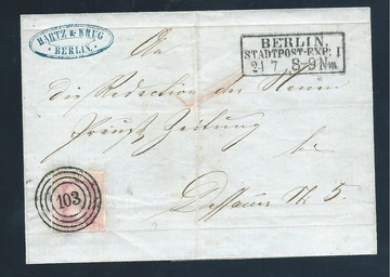 "103" nebst besserem Ra3 "Berlin Stadtpost-Exp. IX" auf Pracht-Ortsbrief mit 1 Sgr. Gittergrund, sign. Banker