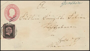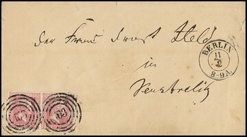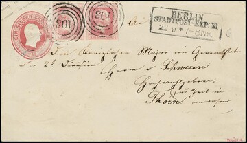 "103" nebst Ra3 "Berlin Stadtpost-Exp. XI" auf Ganzsache 1 Sgr. mit gut gerandetem Paar 1 Sgr. (linke Marke radierter Blaustrich)