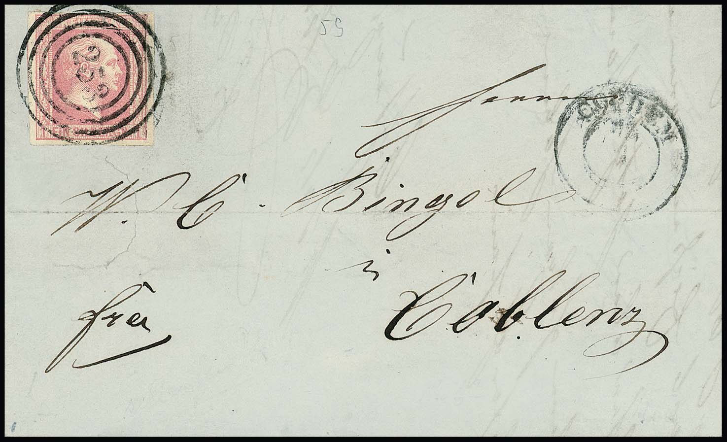 "253" nebst K2 "Cochem" klar auf Brief 1 Sgr. (re. oben nicht ganz perfekt). Späte Verwendung am 28.2.1859!