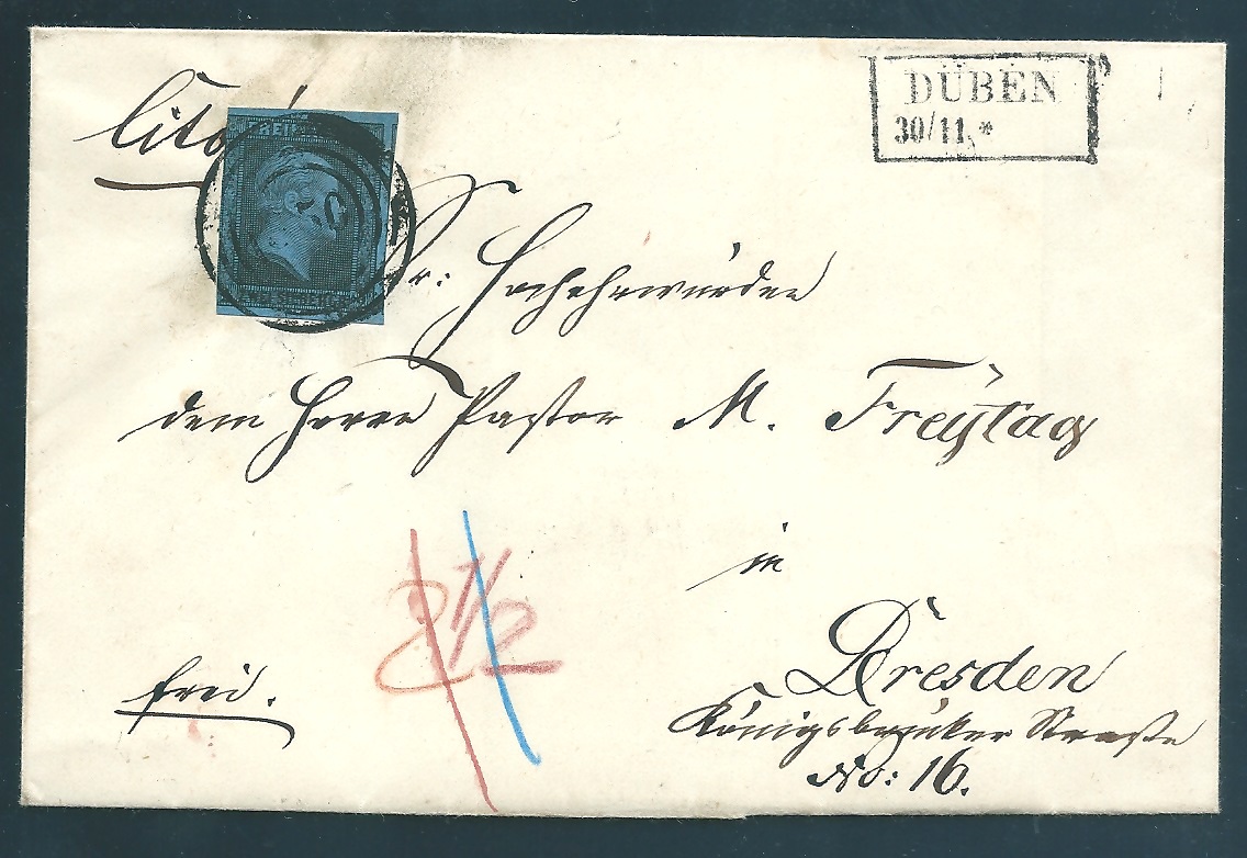 "350" nebst Ra2 "Düben" auf frischem Brief mit 2 Sgr. (links ber.)