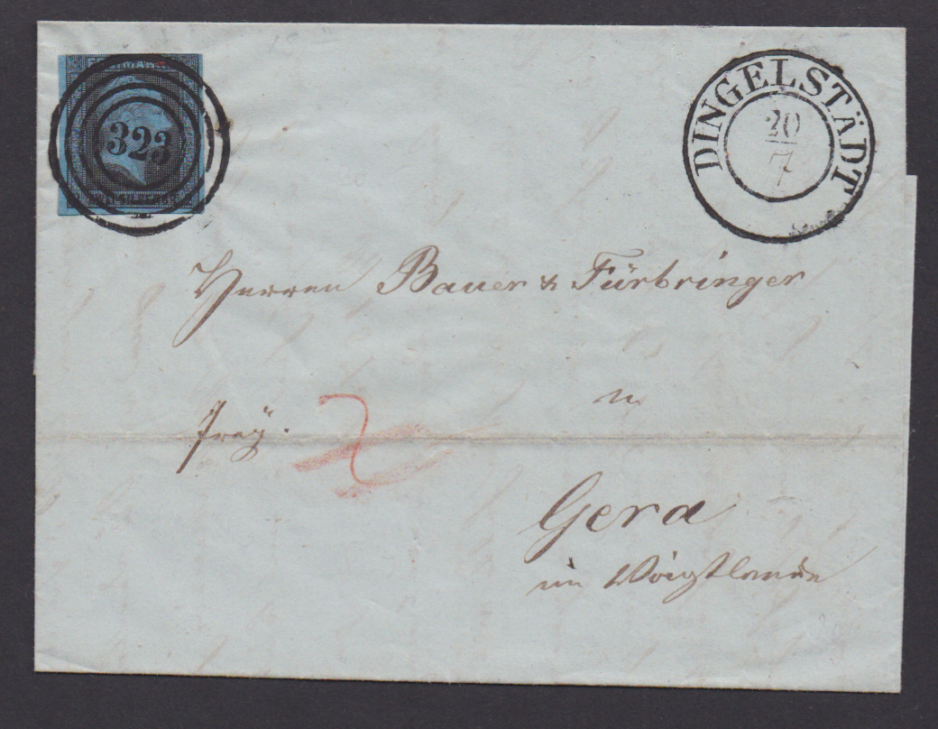 "323" nebst vorphil. K2 "Dingelstädt" mit hs. Monat auf Brief 2 Sgr. (oben ber.), sowie auf loser 1/2 Sgr.