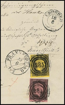 "285" nebst K2 "Crossen" auf großem Teil von Post-Ins.-Adresse mit je einseitig ber. 1 und 3 Sgr.