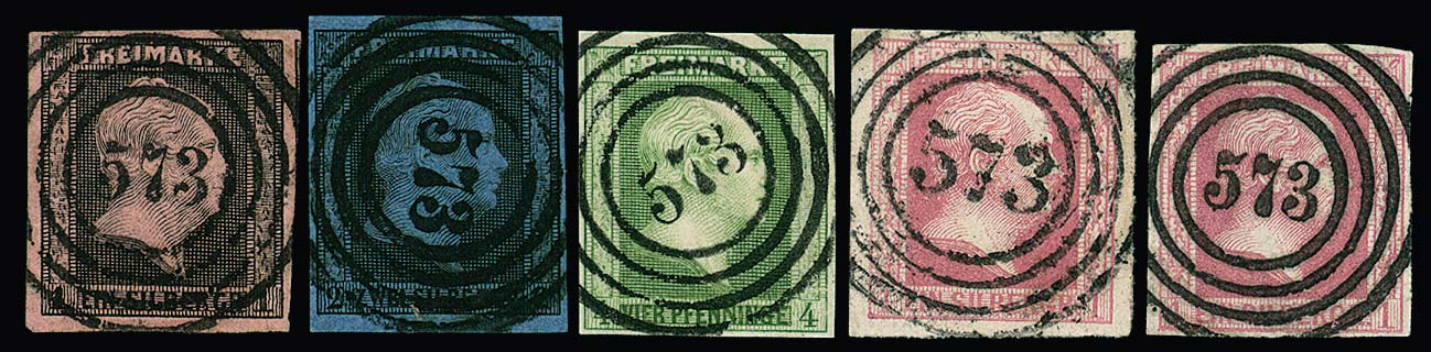 "573" (Halle a.S. Bahnpost, Typen inkl. der seltenen großen), je ideal zentr. auf fünf Werten in meist Luxuserhaltung