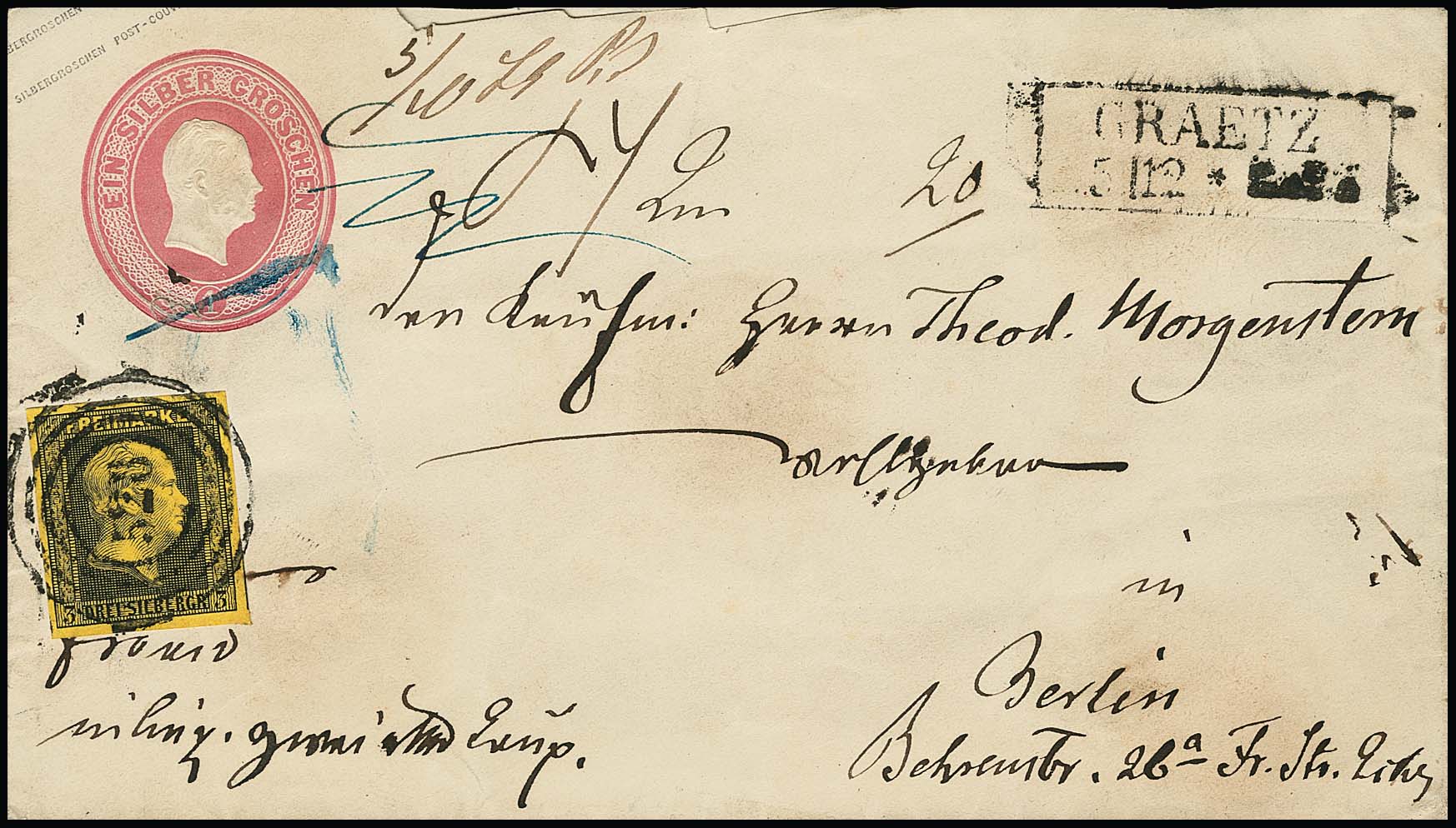 "528" nebst Ra2 "Graetz" klar auf Ganzsache 1 Sgr. mit ZuF 3 Sgr., tadellos, als Wertbrief gelaufen