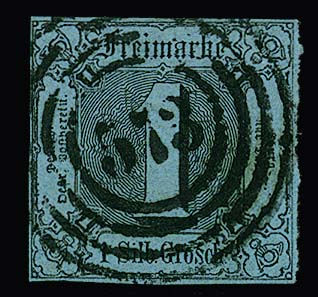 "573" (Halle Bahnpost) in Typen, dabei die gute mit großen Ziffern, klar als bessere Fremdentwertung auf drei Werten Taxis 1 Sgr.