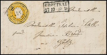 "547" nebst Ra2 "Grottkau" auf Faltbriefchen mit rund geschnittenem Ganzsachen-Ausschnitt 3 Sgr. gelborange
