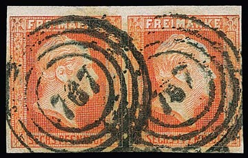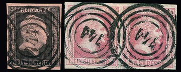 "744" (Königswinter) zentr. auf Kabinettstück 1 Sgr., sowie auf Paar 1 Sgr. rosa (eine Marke min. gerauht)