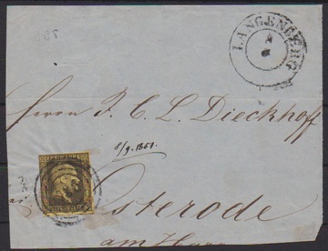 "796" nebst Ra2 "Langenberg" auf Briefvs. mit etwas ber. 3 Sgr.