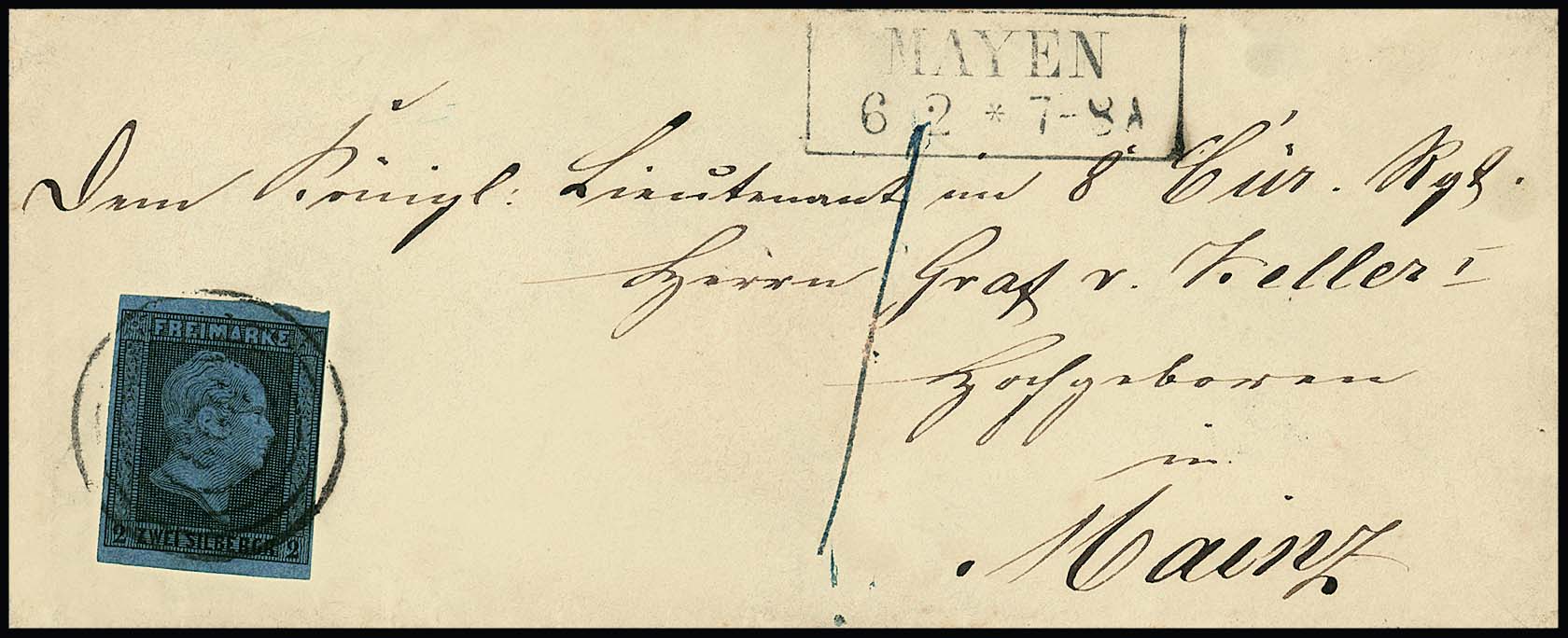 "923" nebst Ra2 "Mayen" klar auf ursprünglich erhaltenem Damencouvert mit 2 Sgr., diese rechts voll-, sonst breitrandig und tadellos