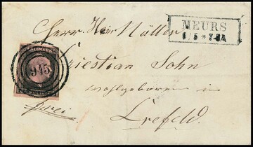 "945" nebst Ra2 "Meurs" auf Briefchen mit 1 Sgr. (re. oben berührt), dazu NS auf drei losen Marken und K2 auf Dreierstreifen