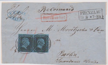 "1161" nebst Ra2 "Prenzlau" auf Recobrief-Vs. (auf Unterlage geklebt) mit Paar 2 Sgr. (unten ber.)