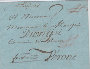 "Erfurt", (1800), blaue Adelsbriefhülle mit hs. Aufgabe "v. Erfort" eingeschrieben (NB-Zeichen) nach Verona, "fr. Trento"