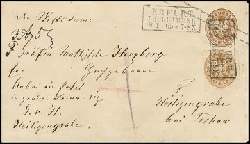 "Erfurt Packkammer", seltener Ra3 als Entwertung auf dekor. Ganzsachen-Couvert 3 Sgr. braun mit 3 Sgr. braun als ZuF