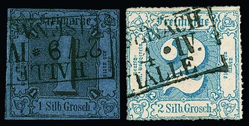 "Halle-Eisenach", bzw. "Eisenach-Halle", preußischer Bahnpost-Ra3 je als Fremdentwertung auf Taxis 1 Sgr. (erste Ausgabe) bzw. 2 Sgr.
