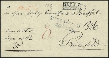 "Halle bei Bielefeld", 1825, seltener Postwärter-L2, nebst L2 "Bielefeld", auf Brief