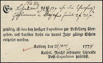 "Koblenz", 1778-1791, vier dekorative Ortsdruck-Reichspostscheine