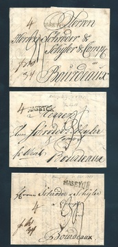 "Königsberg", 1786-87, drei Briefe je mit L1 "MASEYCK" nach Bordeaux