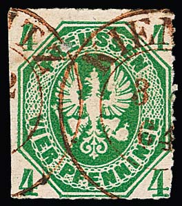 "Kienitz", roter K2 des Hilfspostamtes klar auf 4 Pfge. grün (etwas Schere), auf diesem Wert ungewöhnlich!