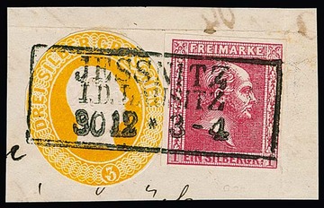 "Jessnitz i.d. Lausitz", Ra3 klar auf Briefstück mit 1 Sgr. karmin und rundgeschnittenem Kopf-Ganzsachen-Ausschnitt 3 Sgr. orangegelb