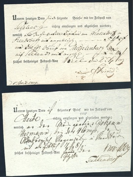 "Itzhoe", "Oldesloe", "Feldpost-Amt", zwei seltene Post-Einlieferungsscheine von 1809