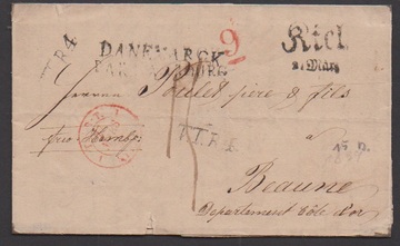 "Kiel", 1835, Fraktur-L1 (nebst Transit-L2 "Hamburg") auf Brief nach Berlin, sowie Fraktur-L2 auf Auslandsbrief (u.a. L2 "DANEMARCK PAR HAMBOURG") nach Beaune/Frankreich