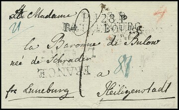 "Ratzeburg", 1813, schwarzer L2 "P.128.P. RATZEBOURG" und seltener Transit-L3 "FRANCE PAR LUNEBURG" (Feuser 295/1000,-) auf Brief mit Inhalt nach Heiligenstadt