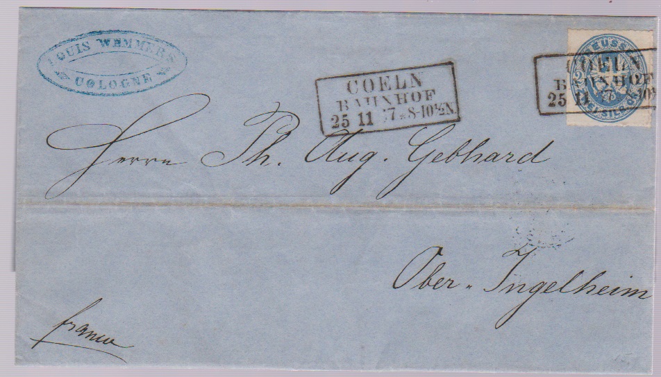 "Ober-Ingelheim", besserer neuer Preußen-Grotesk-K1 klar rs. als Ankunftsstempel auf Faltbrief 2 Sgr. von Cöln dorthin, 25.11.67