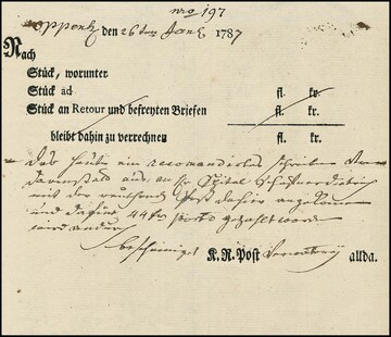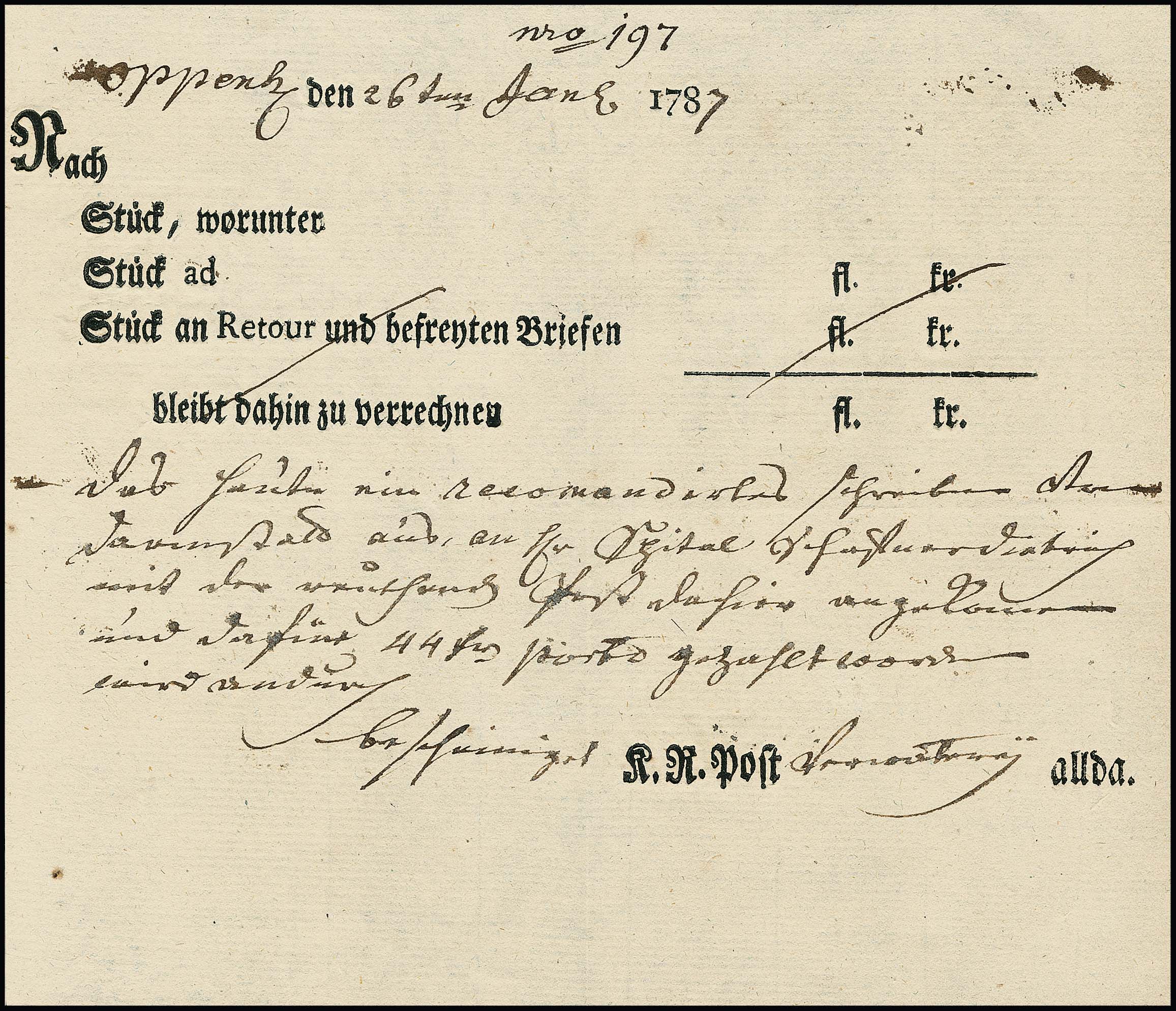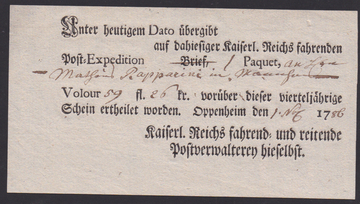"Oppenheim", 1787, "K.R. Post Verwaltung allda", seltenes "Postkarten"-Formular über die Verrechnung von 44 Kreuzern für ein recommandirtes Schreiben