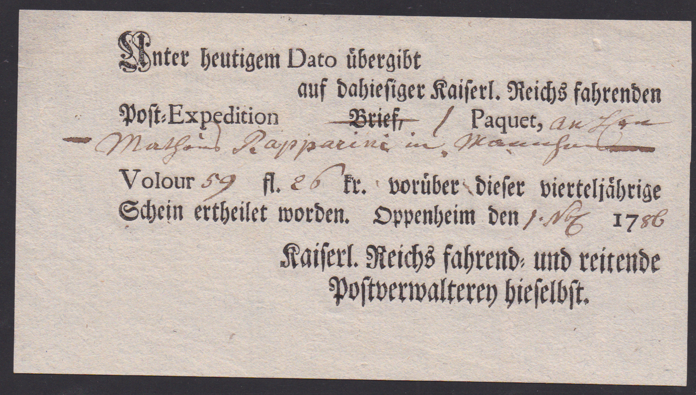 "Oppenheim", 1786, Ortsdruck-Postschein, "Kaiserl. Reichs fahrend= und reitende Postverwaltung hieselbst"